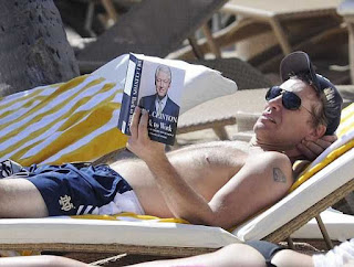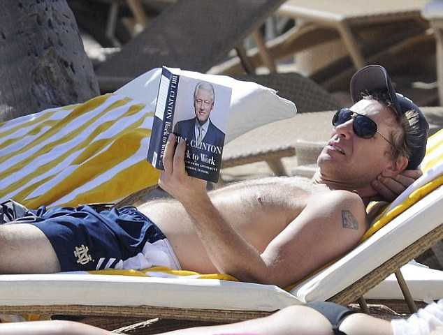 Topping up the tan! The singer relaxes on his lounger while reading Bill Clinton's Back To Work book