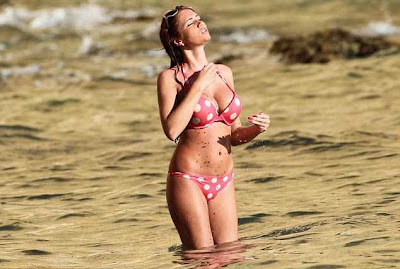 The 21-year-old redhead, who now stars in her own Channel 5 reality show It's All About Amy, hit the beach in a pretty pink and white polkadot bikini as she soaked up the sunshine and enjoying a cooling dip in the water.